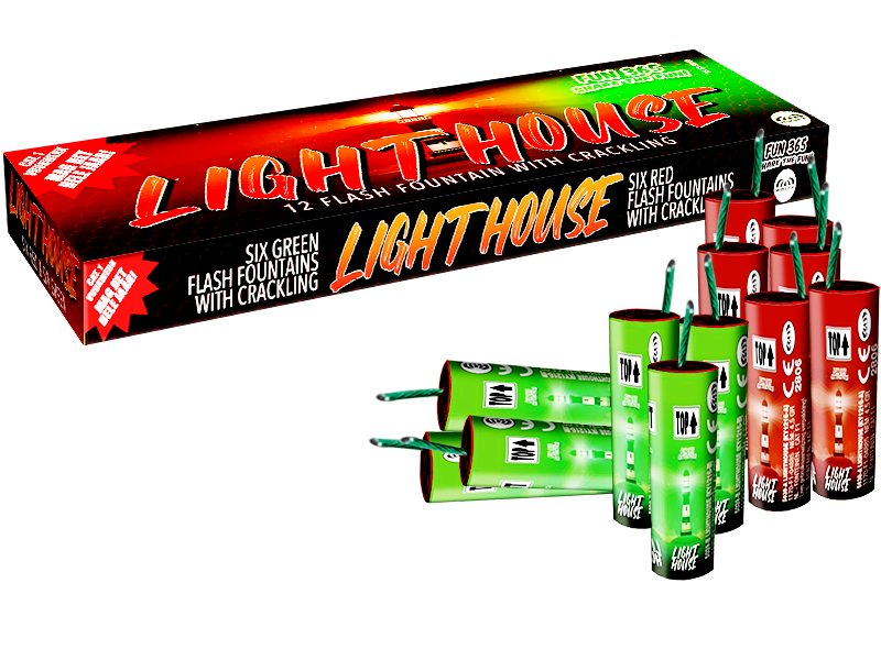 Lighthouse n6 rode en 6 groene flash fonteinen met crackling. n nKruitgewicht 54 Gram nTube diameter – nBrandtijd – Seconden nHoogte – Lighthouse Goedkoop vuurwerk kopen bij Vuurwerkwinkel Heerenveen